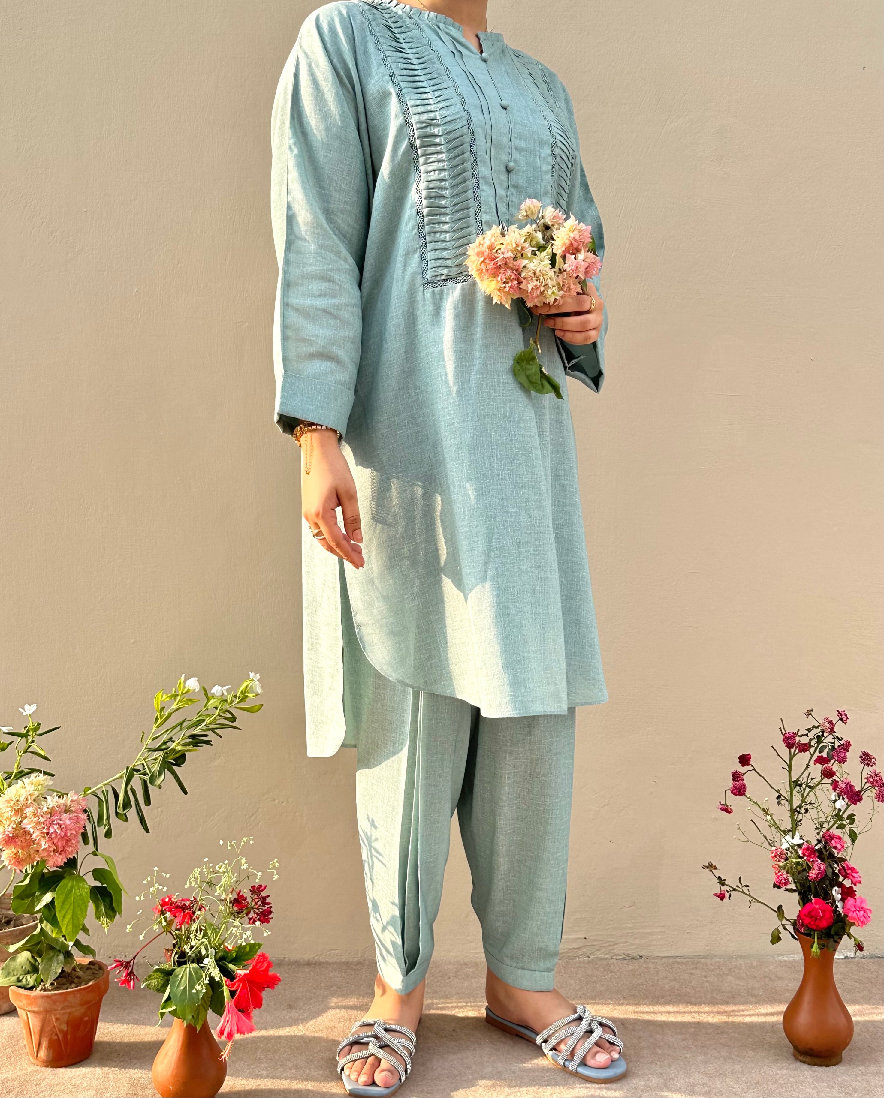 The pleated Neckline with boxy silhouette and pleated smart trouser shalwar giving all the trendy vibes.