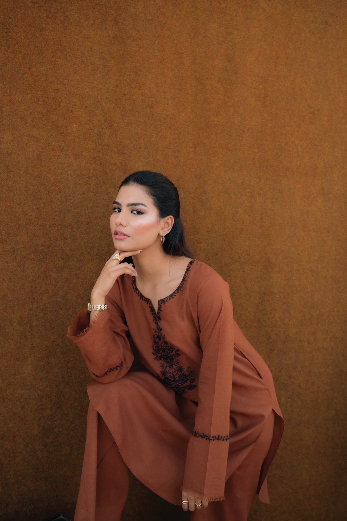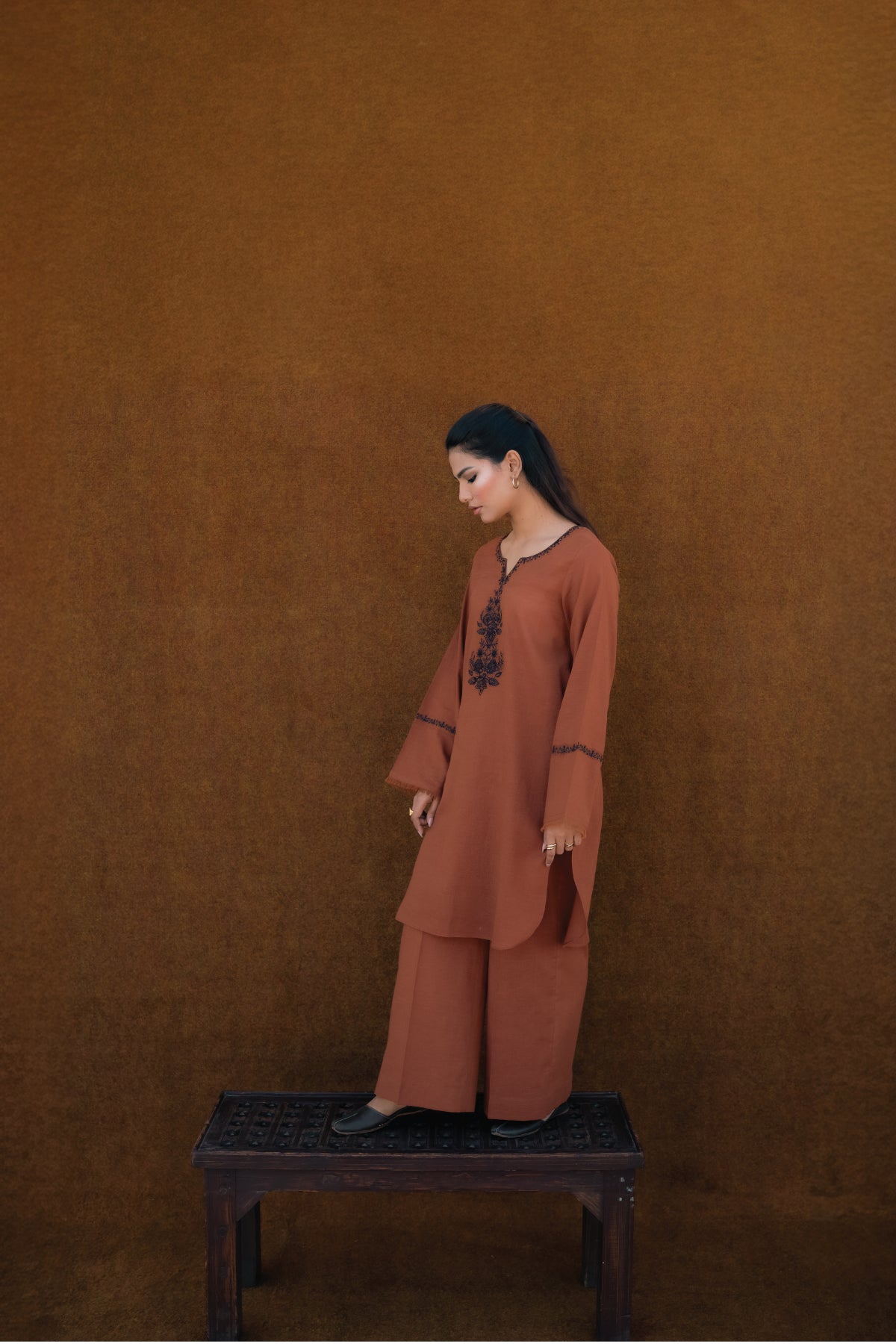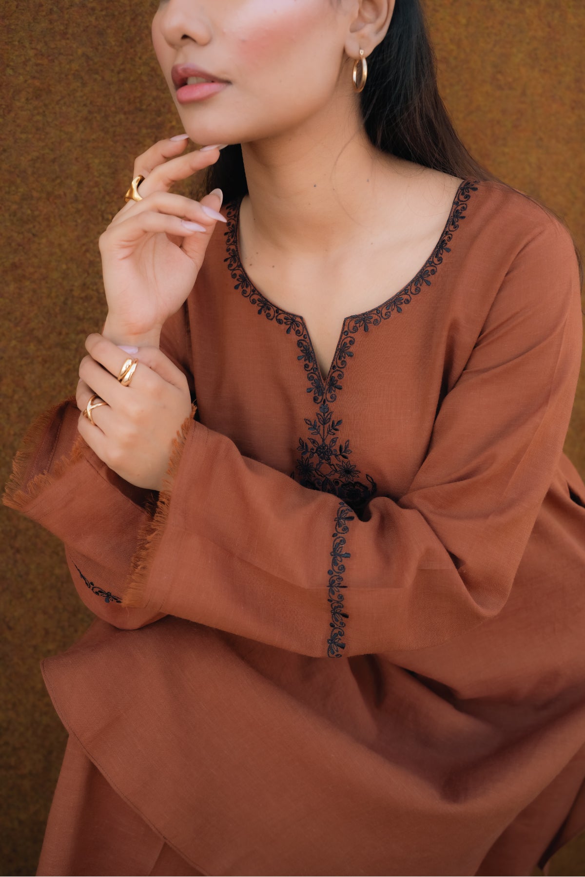 Embroidered shirt with embroidered neckline and sleeves with frayed hem. Shirt features round daman with pockets at sides. Paired with matching wide hem trousers