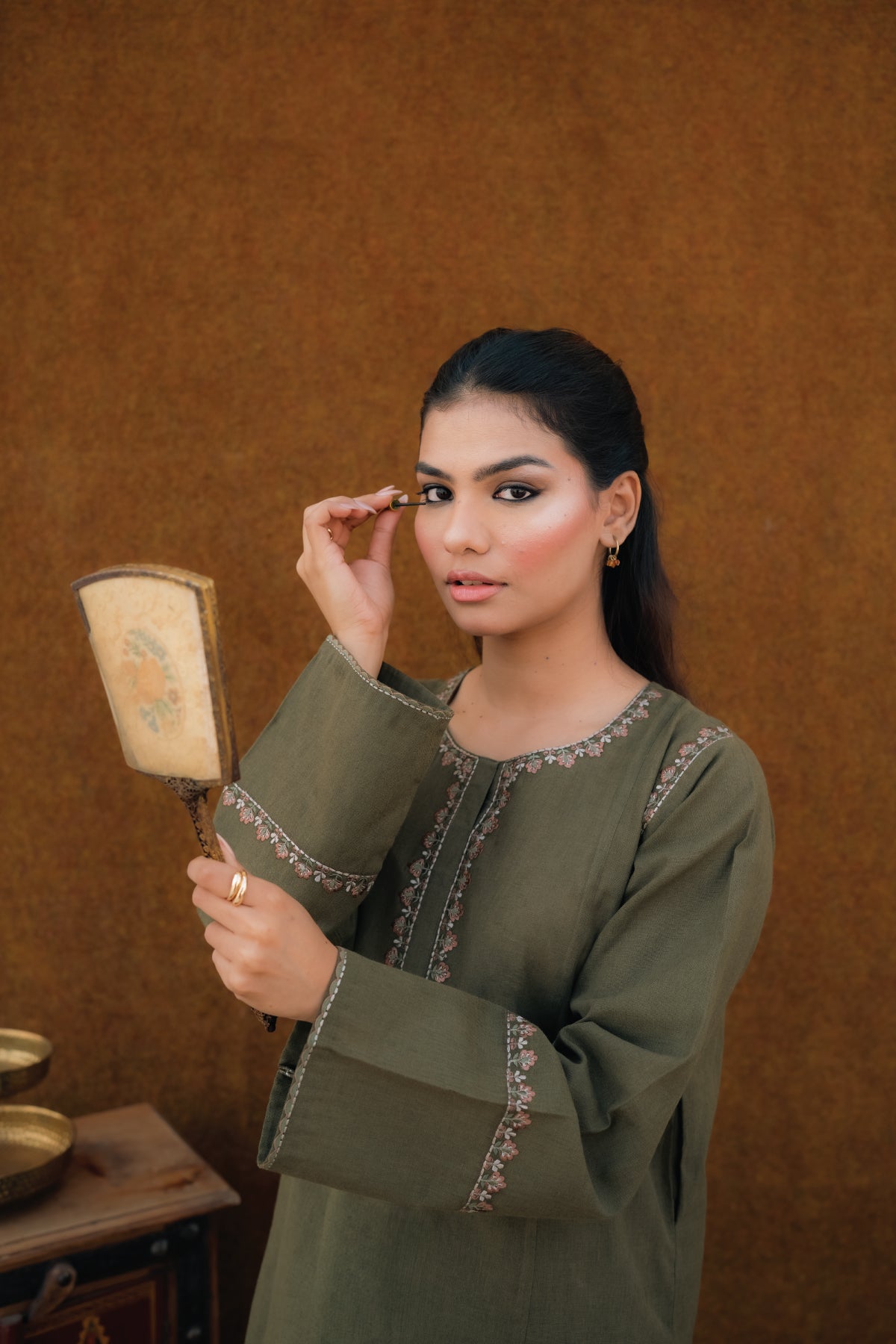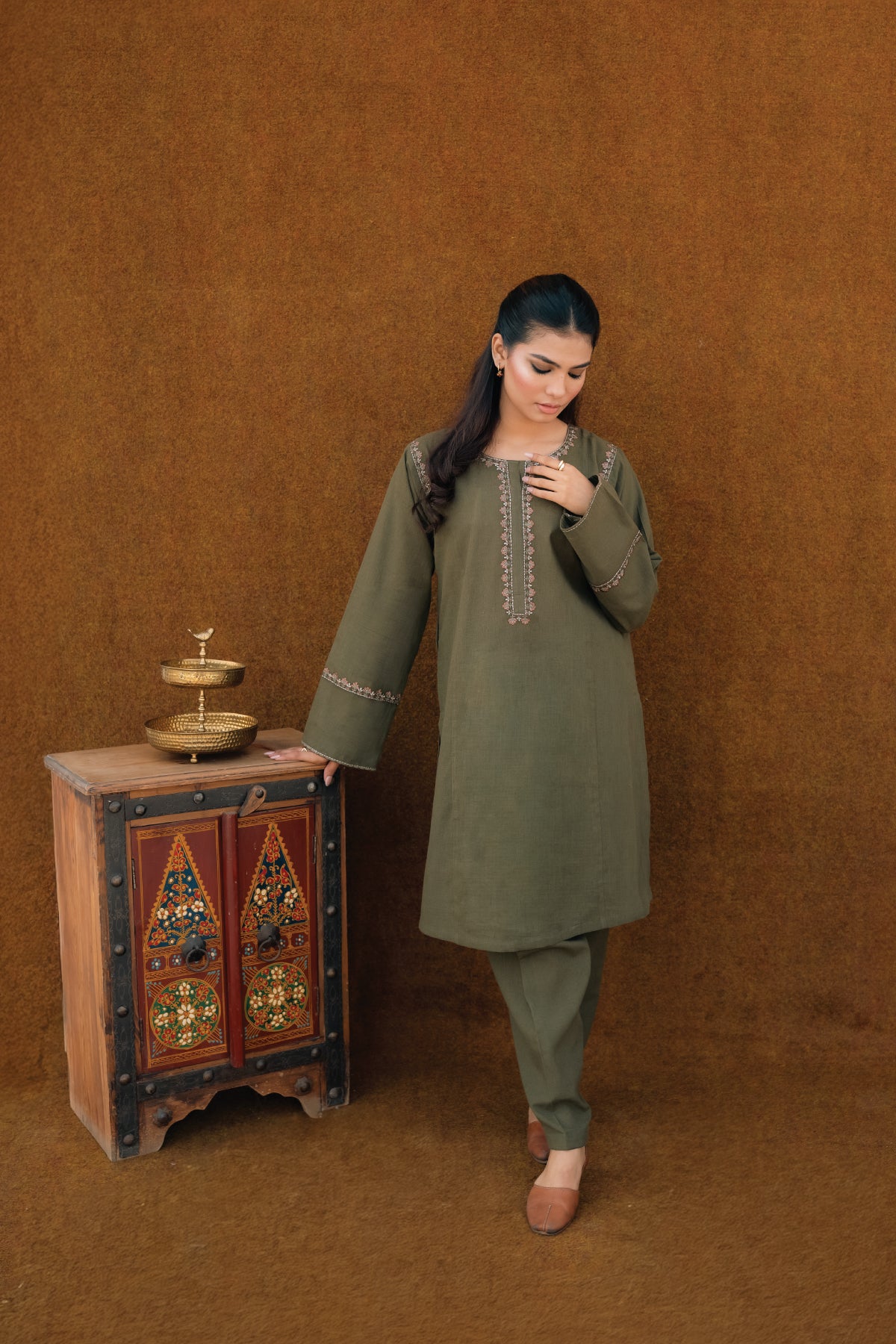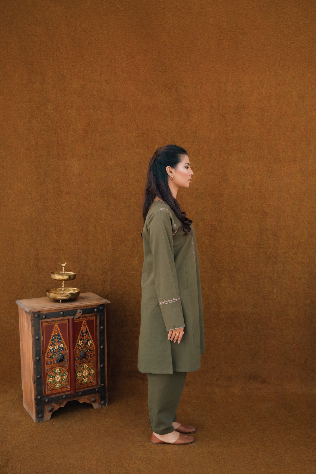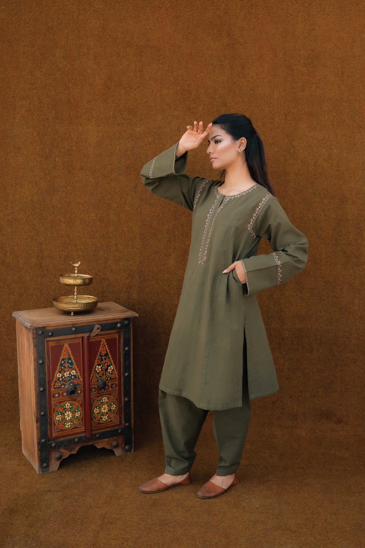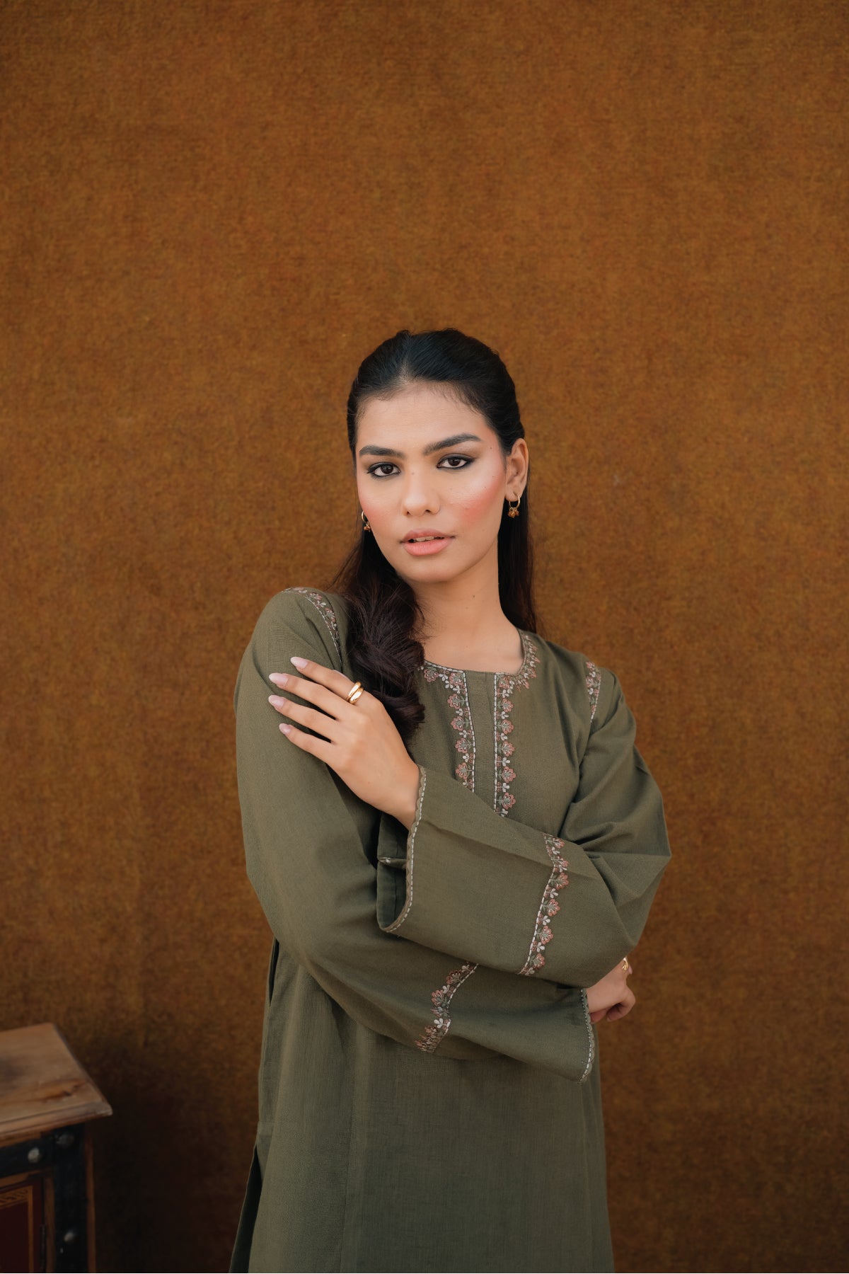 Classic kurta with contrast embroidery around placket and sleeves. Paired with a matching tapered shalwar
