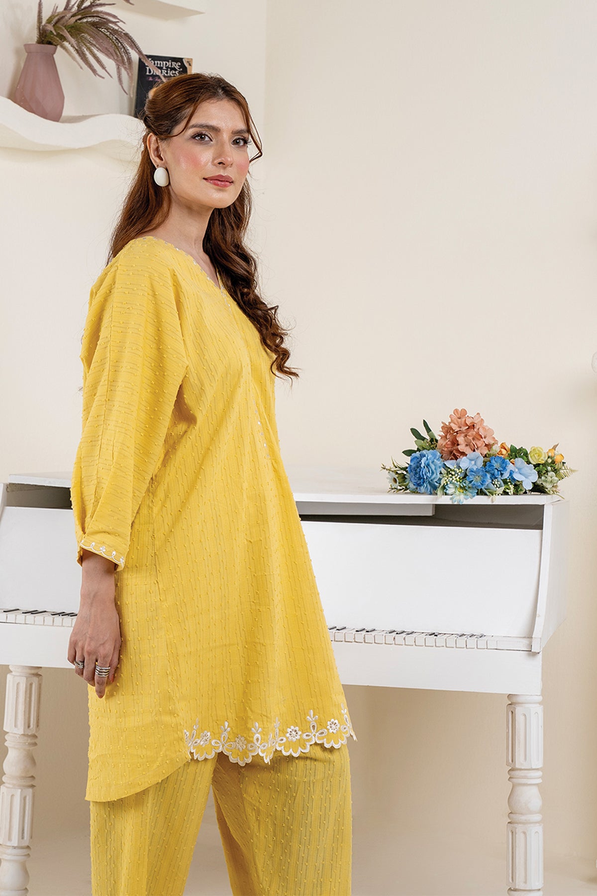 A loose fit shirt in brochia with scalloped embroidery on daman, sleeves and neckline. Paired with a pleated shalwar.