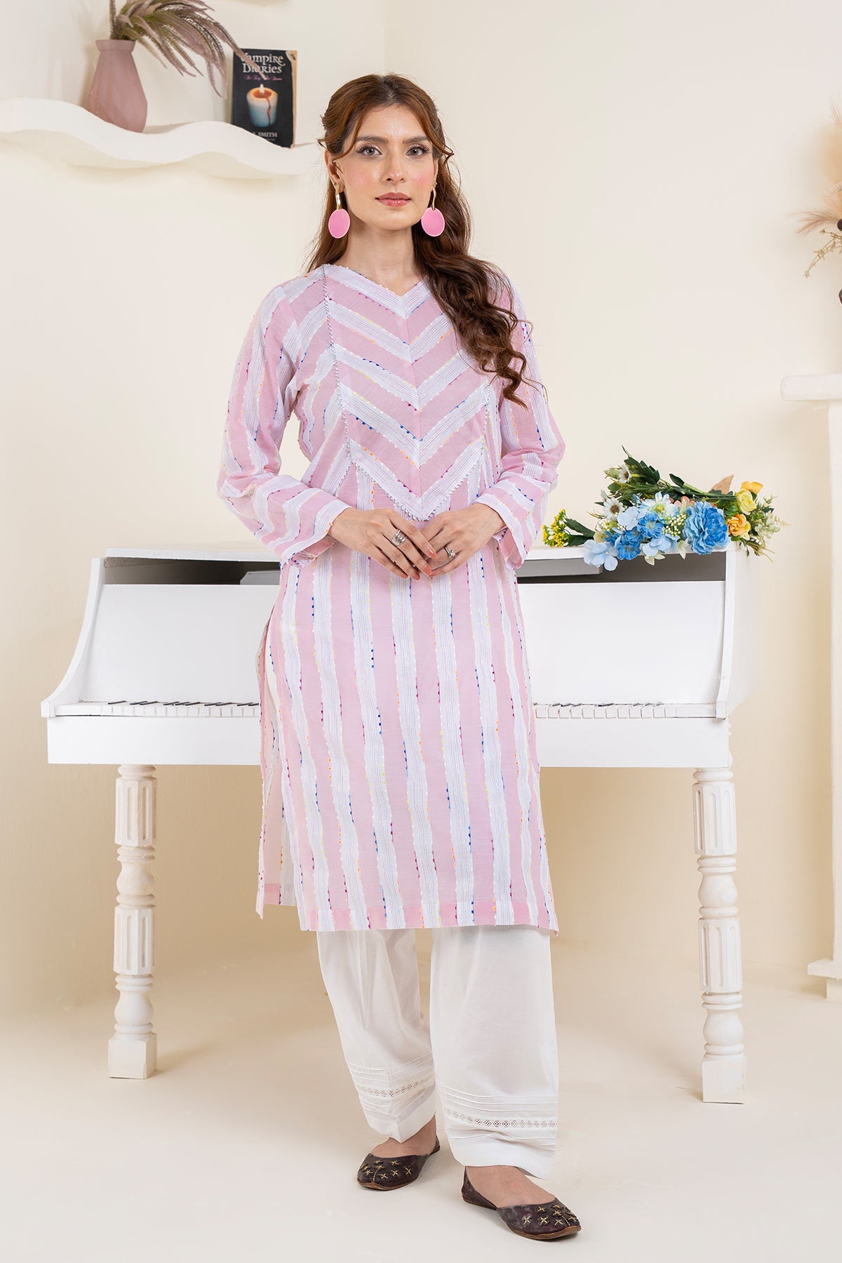 Interesting neckline is made out of striped pattern and cut & sewn detail with a hint of lace inserts. Pair it with your white gharara or white trousers.