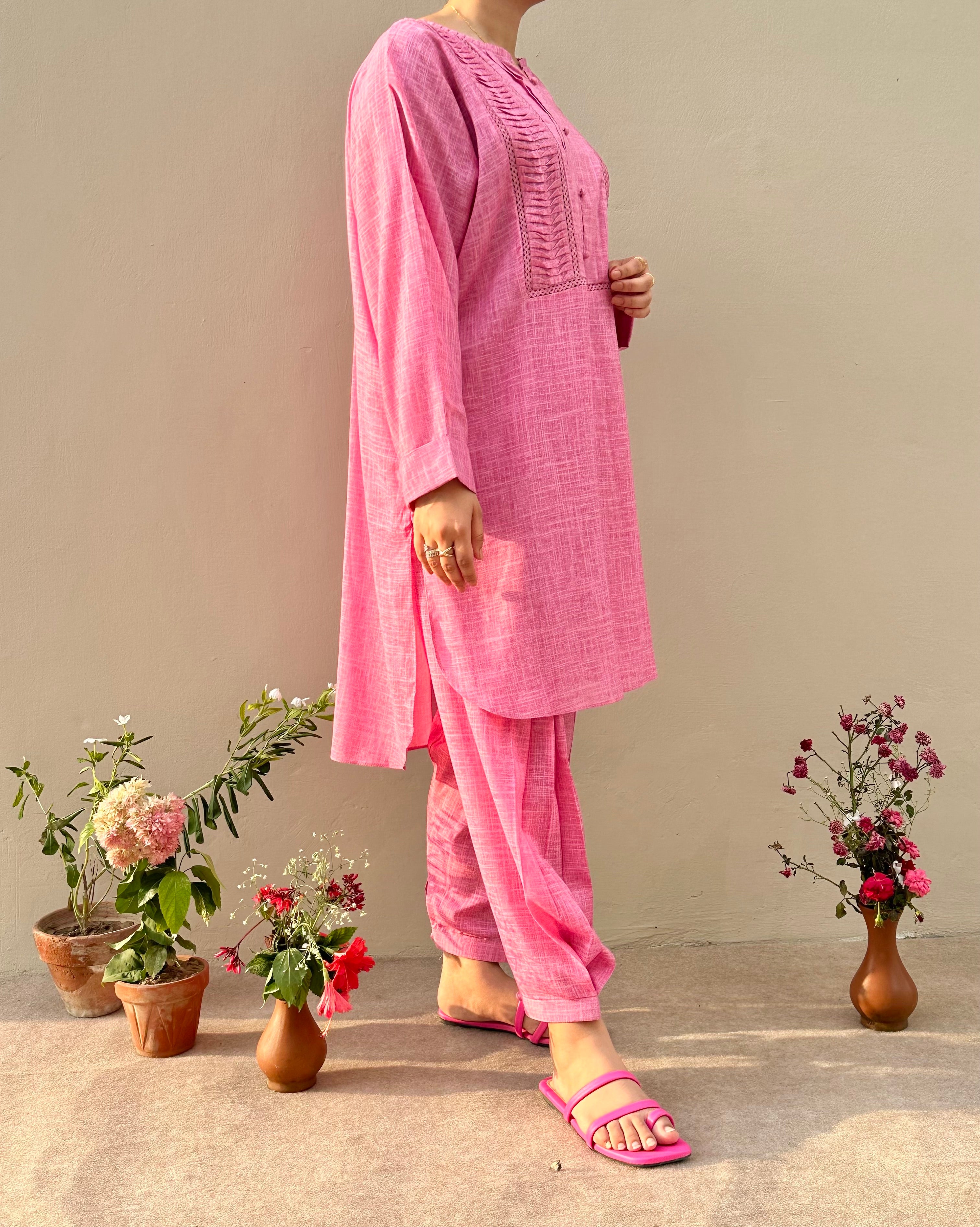 The pleated neckline with boxy silhouette and pleated smart shalwar giving all the rich and trendy vibes.