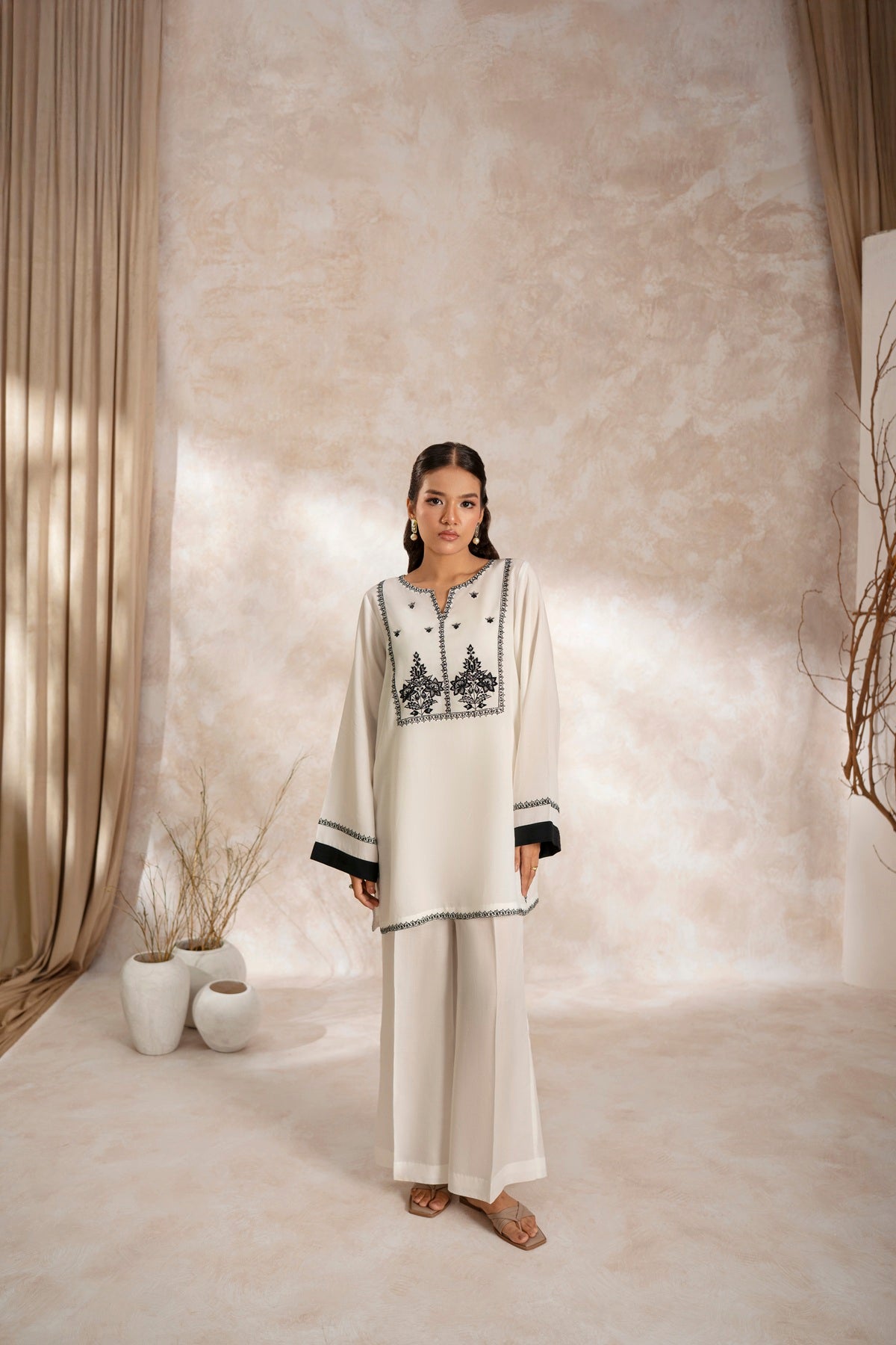 This monochrome look features embroidered neckline, sleeves and hem creating an effortlessly chic look paired with a matching wide leg pants.