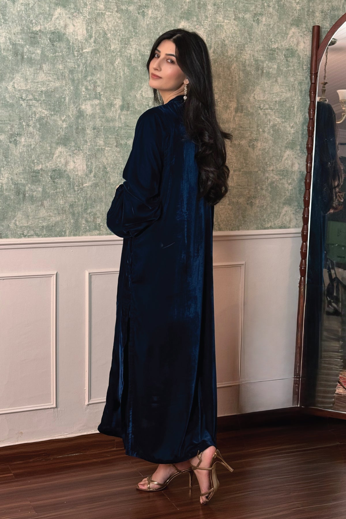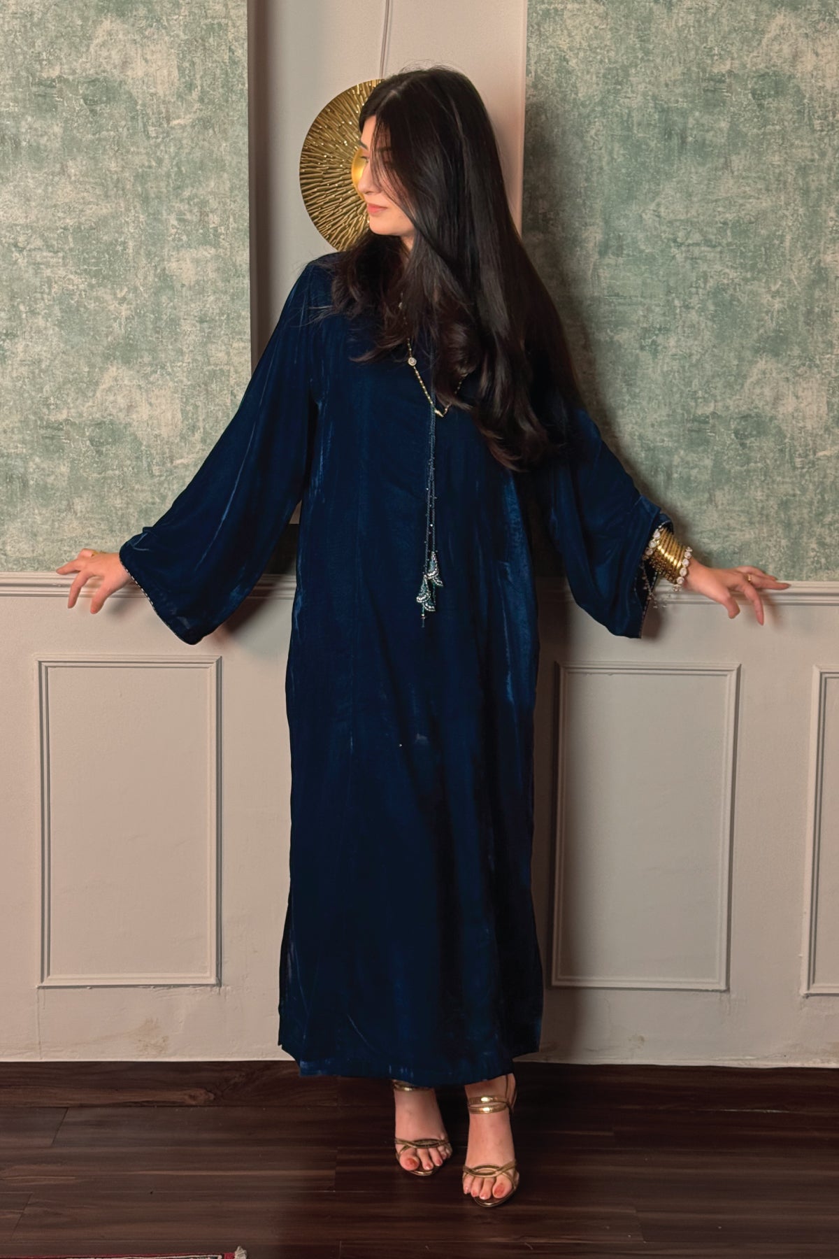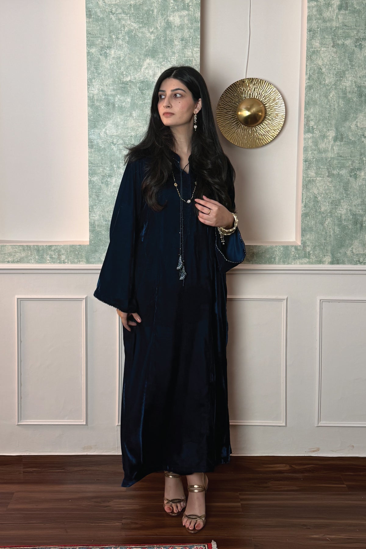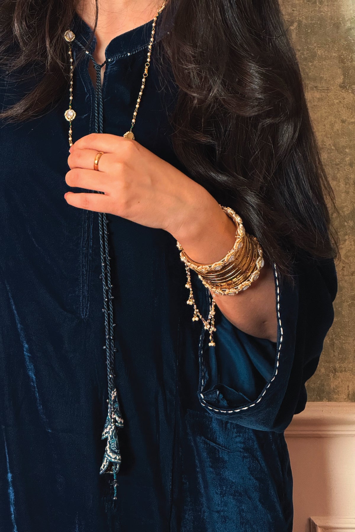 A long panelled shirt features ban collar with embroidered tassled neckline enhanced with sequins. Paired with matching trousers.