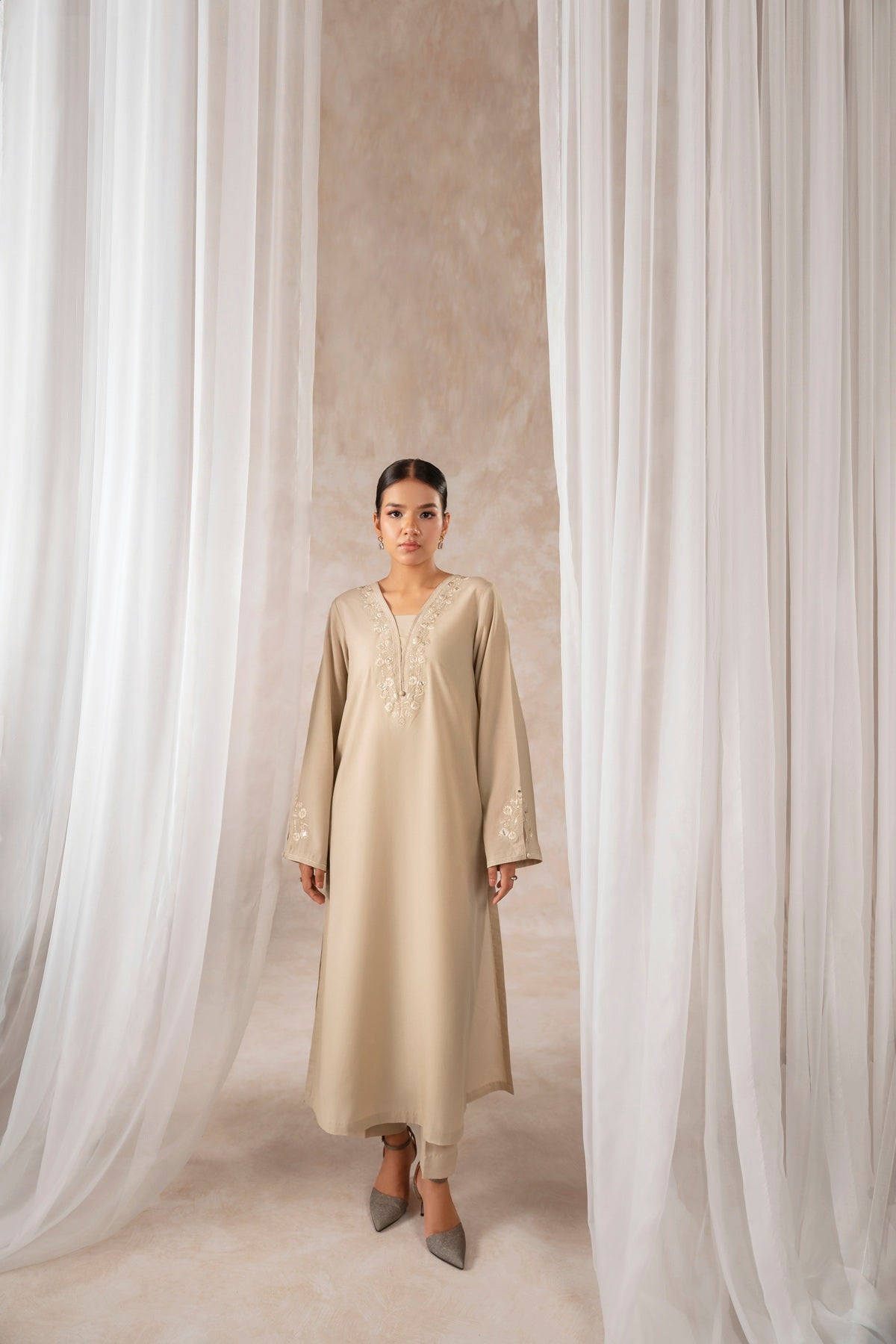 Neem is curated on irish linen and has embroidered neckline and sleeves with some sheesha detail, Creating a minimal look of texture and shine. Paired with a matching trouser.