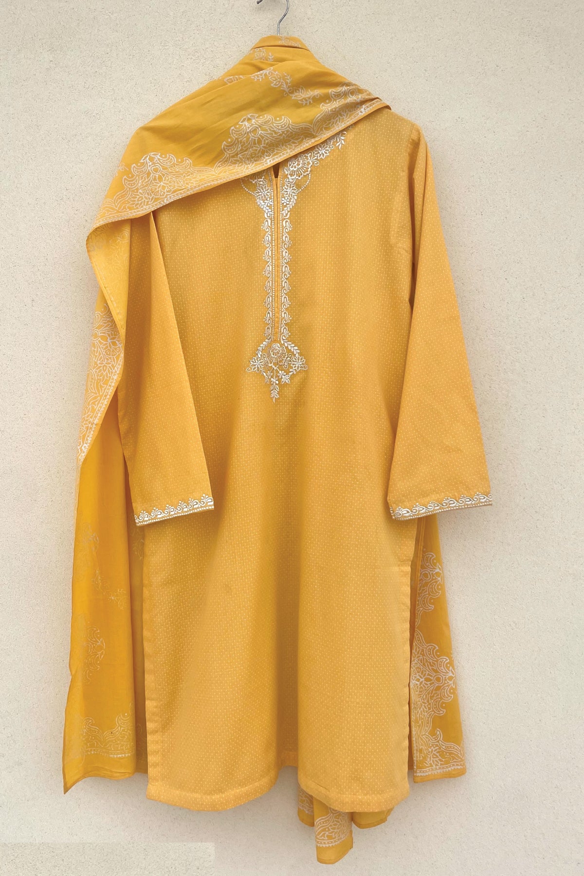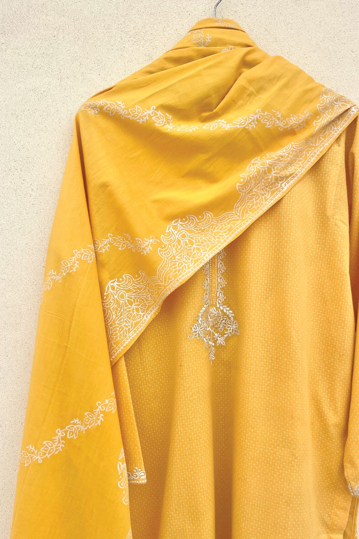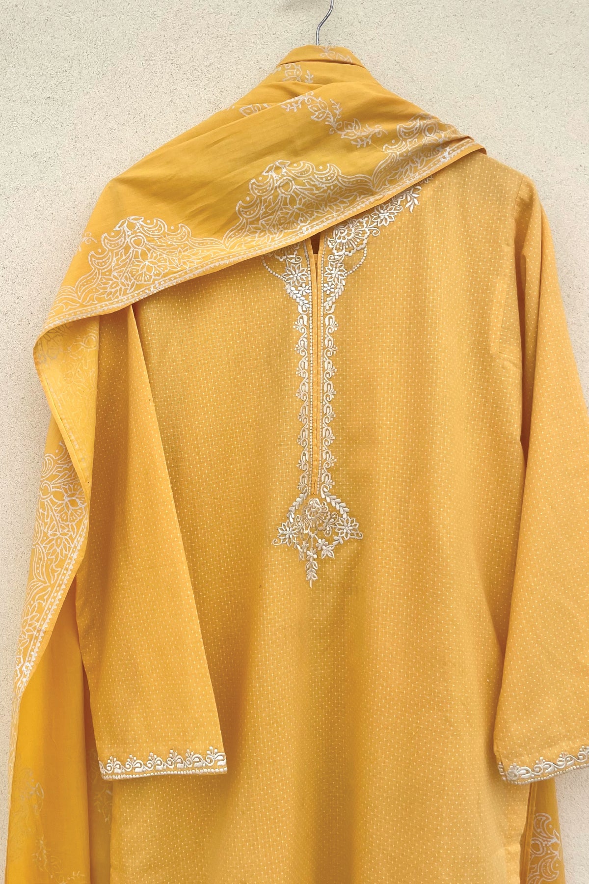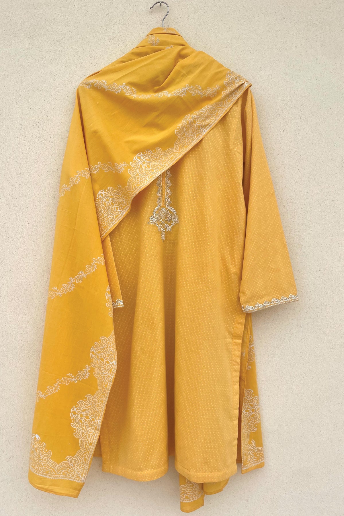 This ensemble is crafted in Jacquard textured fabric, features embroidered neckline and sleeves comes with a block printed lawn cotton dupatta.