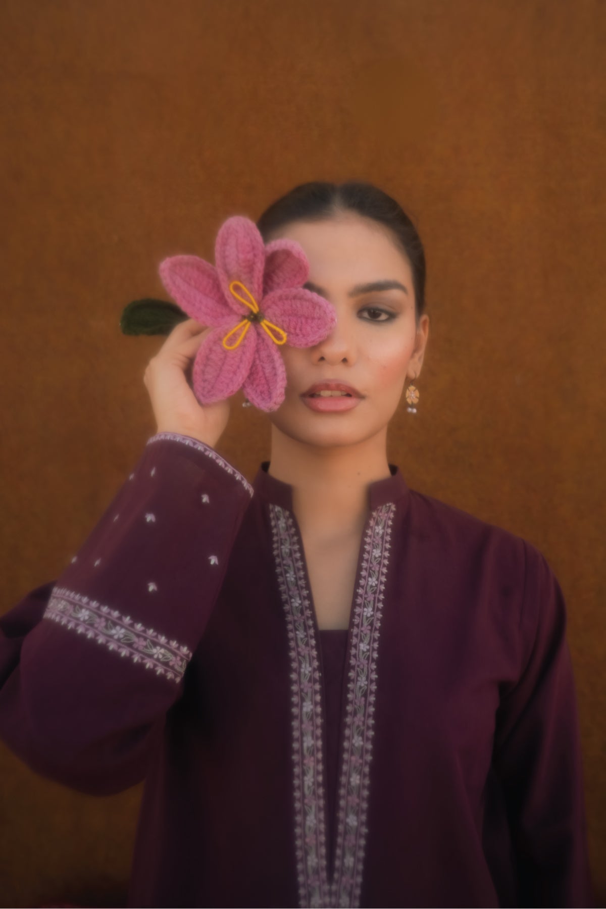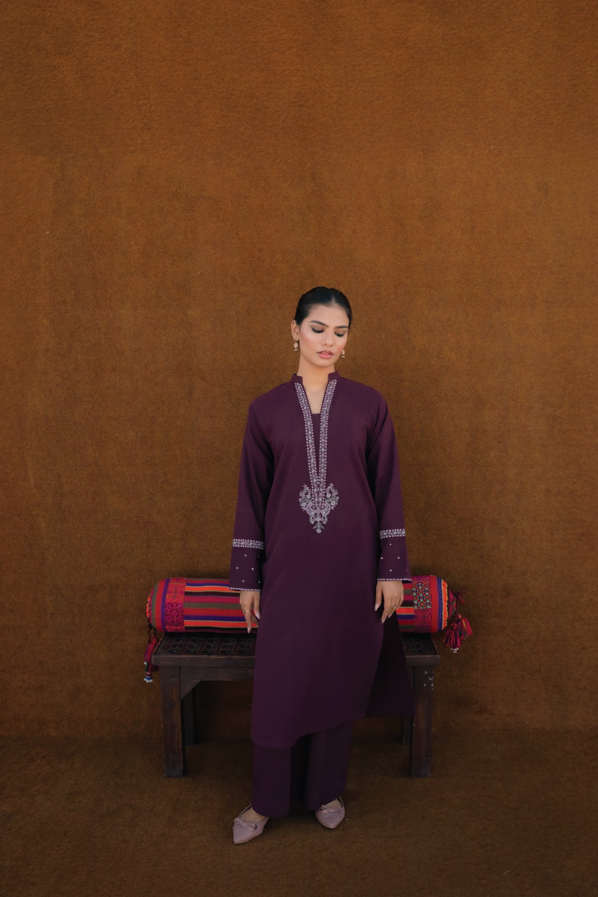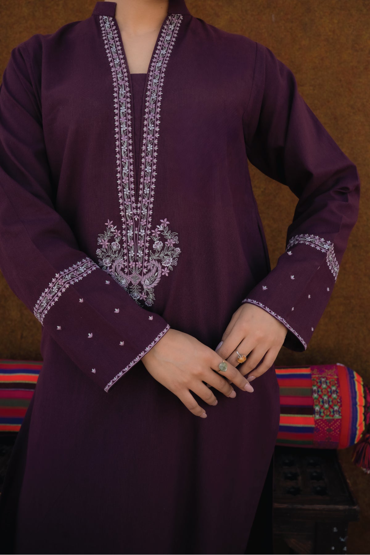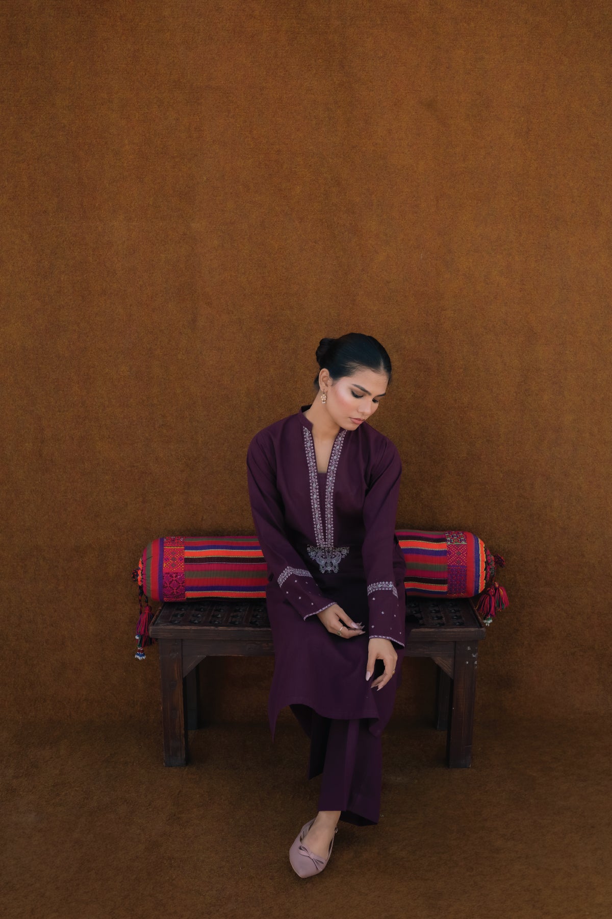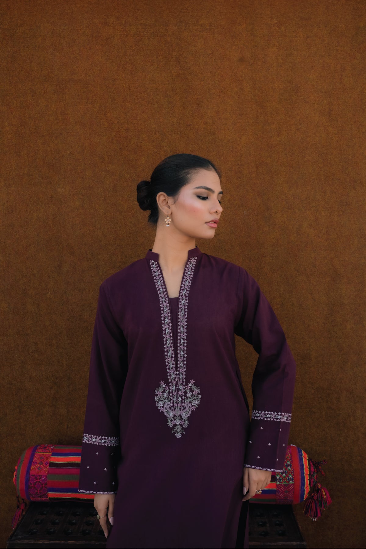 This long shirt features embroidered neckline and sleeves crafted in light khaddar. Paired with matching trousers.