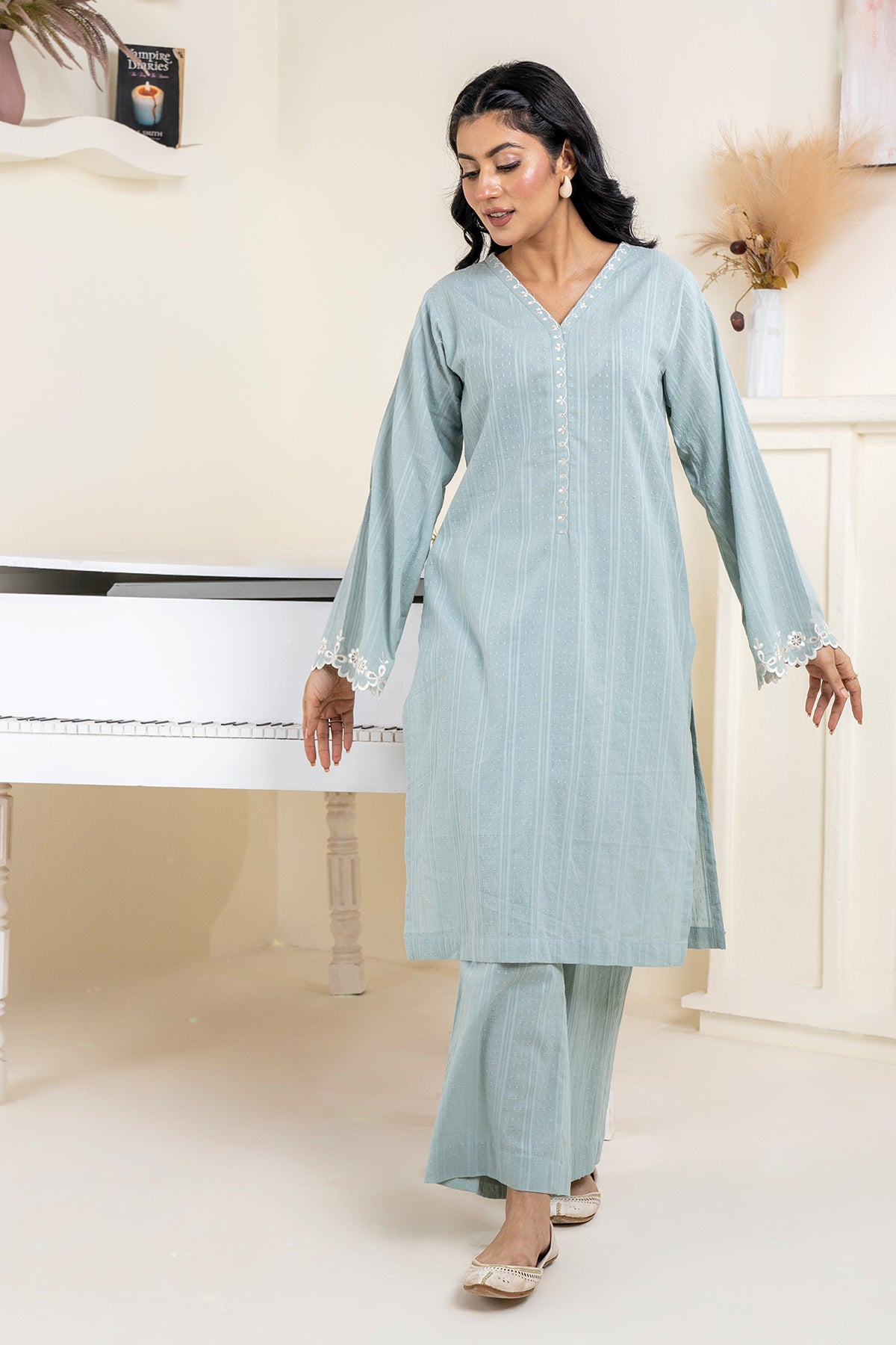 Regular fit shirt with embroidered sleeve and neckline paired with trouser.