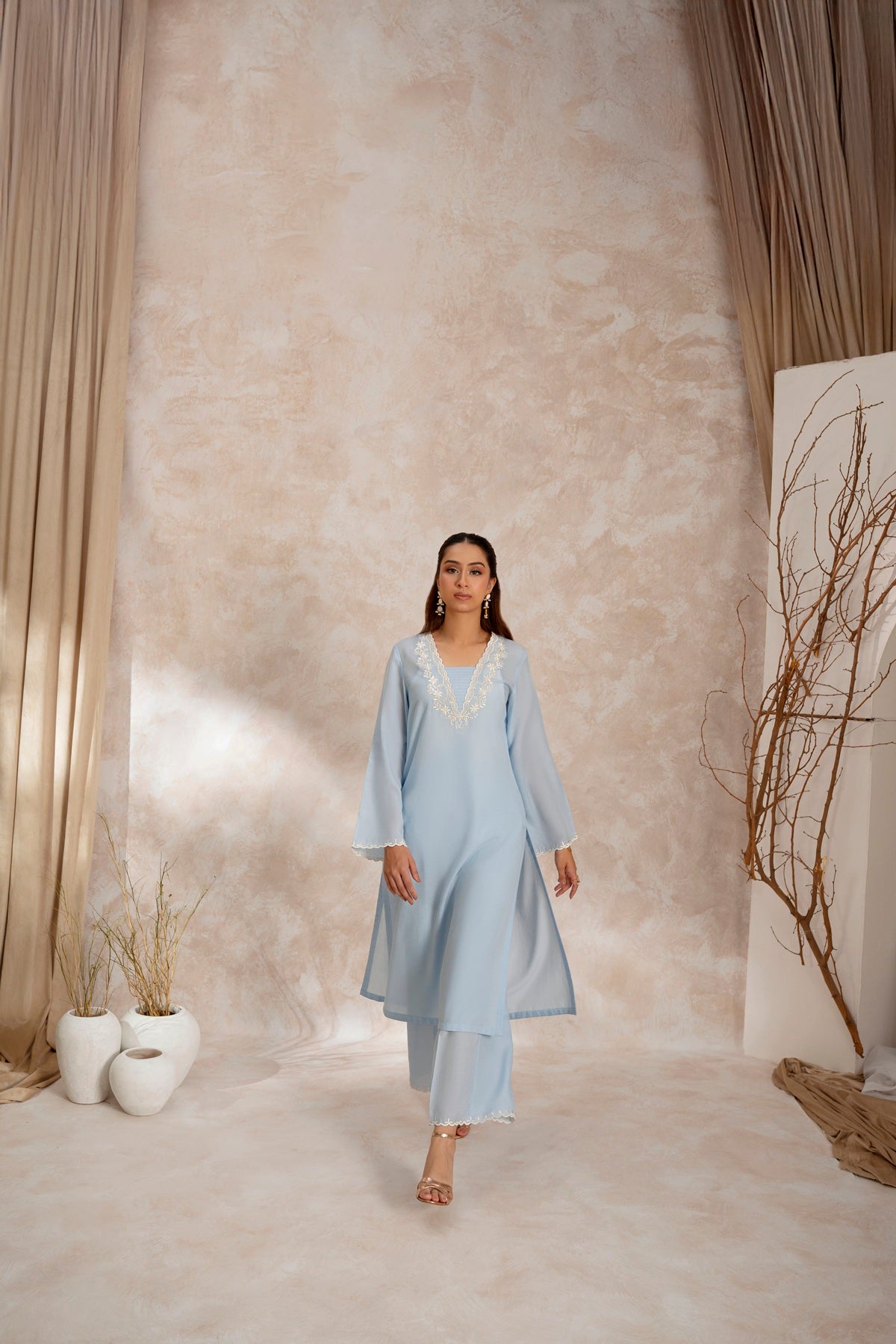 This stunning ensemble is crafted in irish linen, features embroidered scalloped sleeves and neckline with pintuck details. Paired with a matching embroiderd scalloped trouser.
