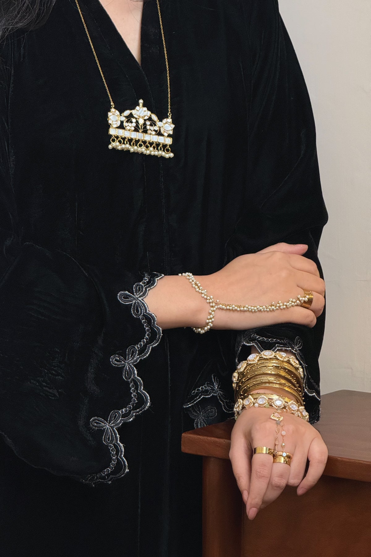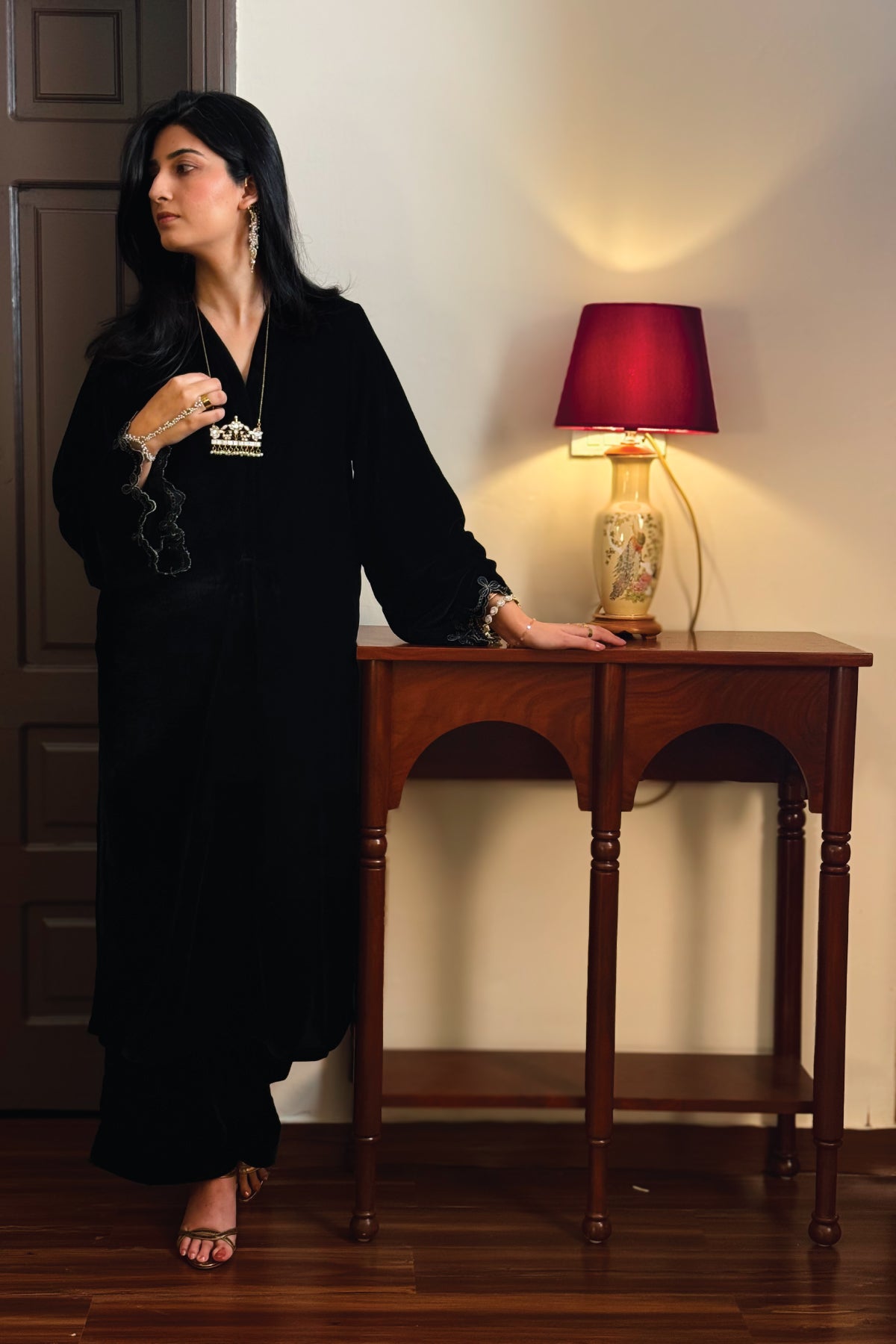 This set features scalloped sleeves with minimal embroidery and stylised neckline. Paired with matching wide leg trousers.