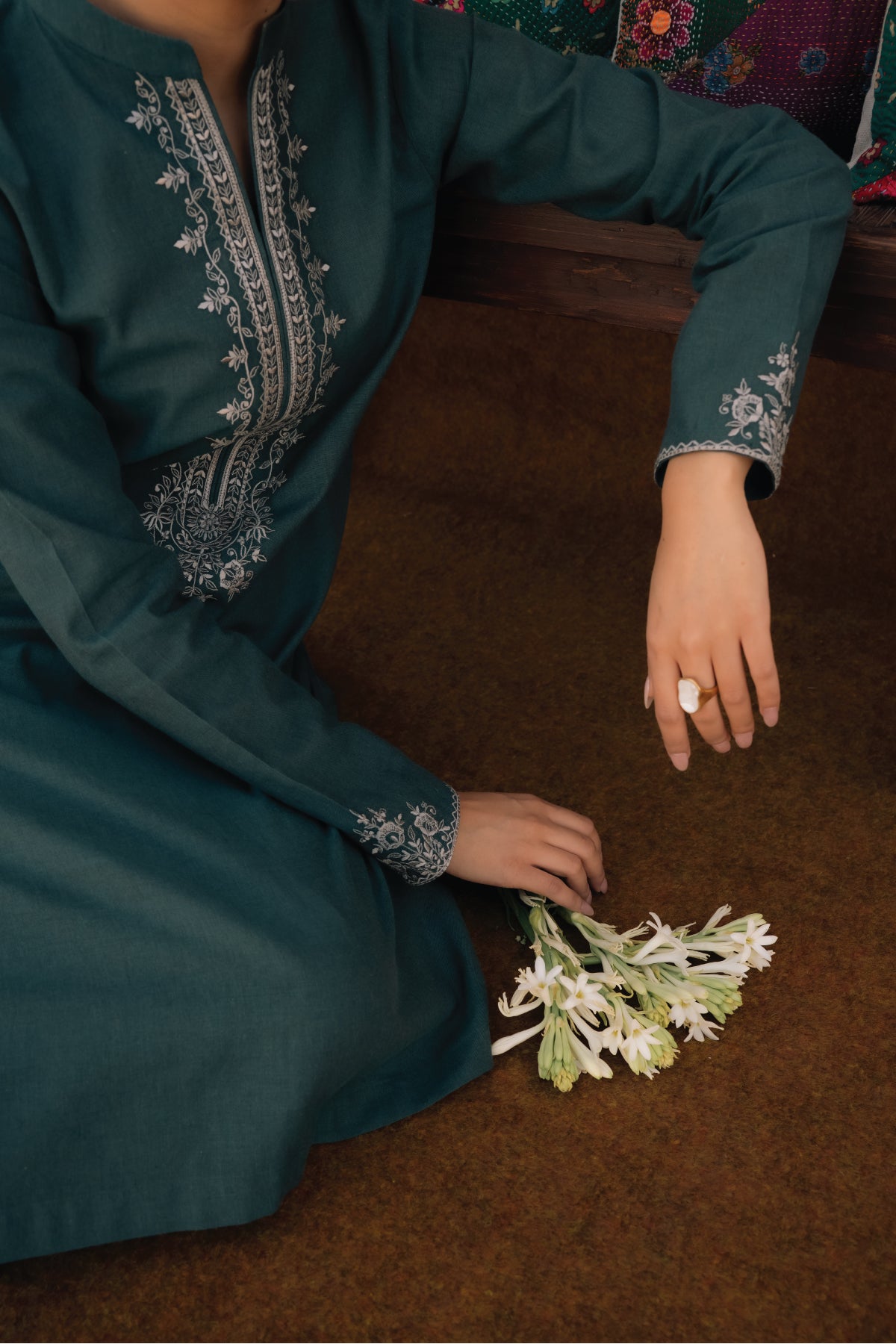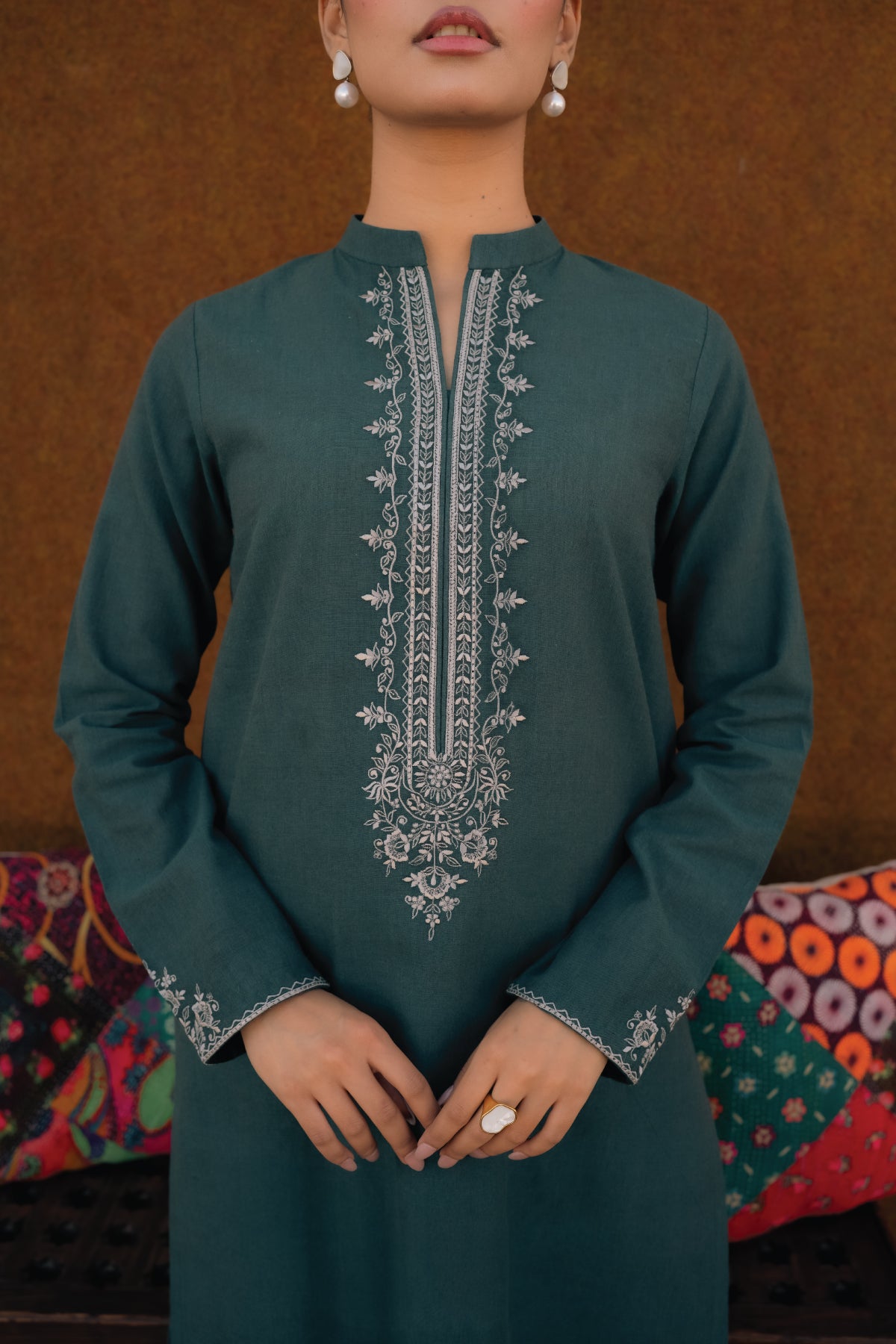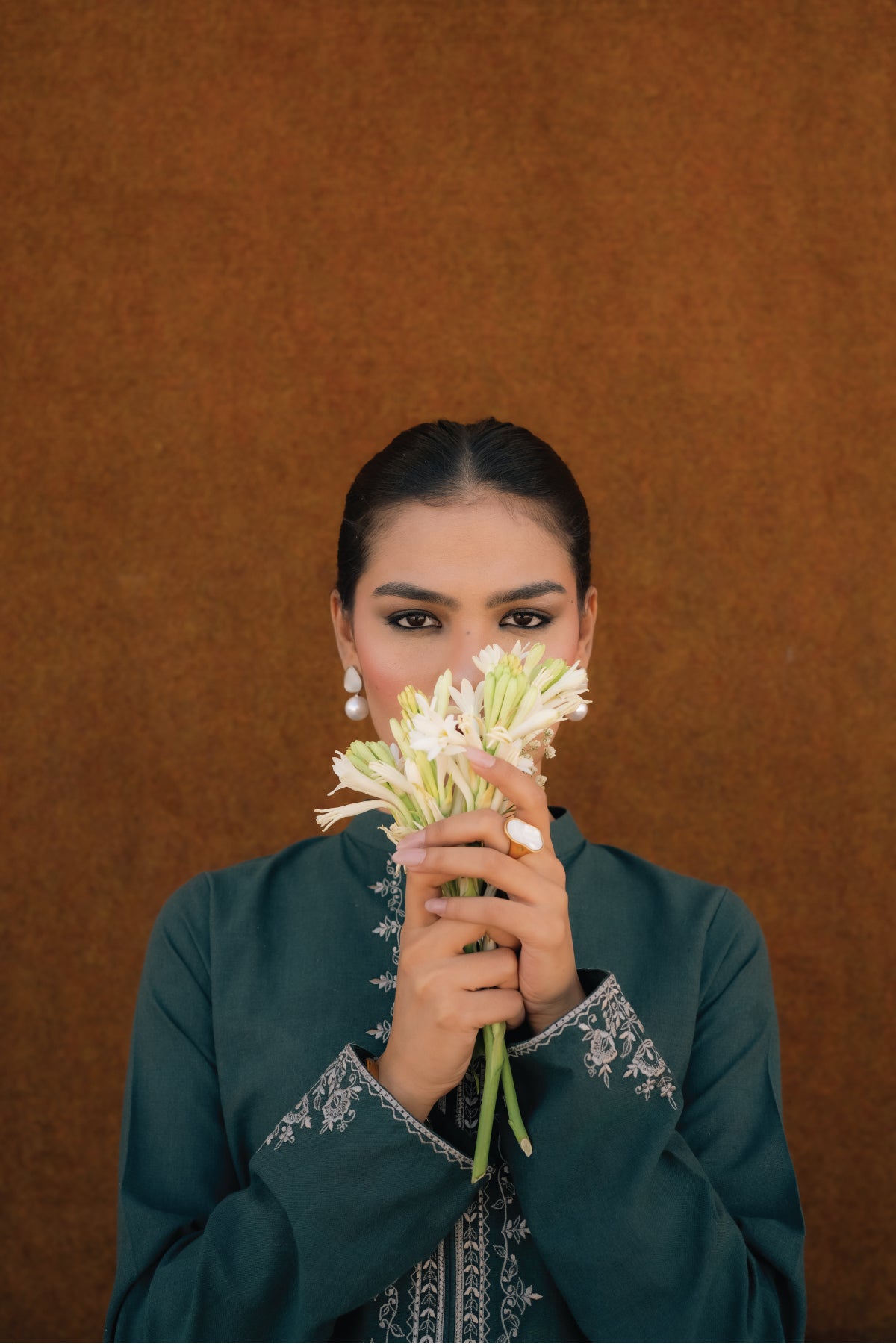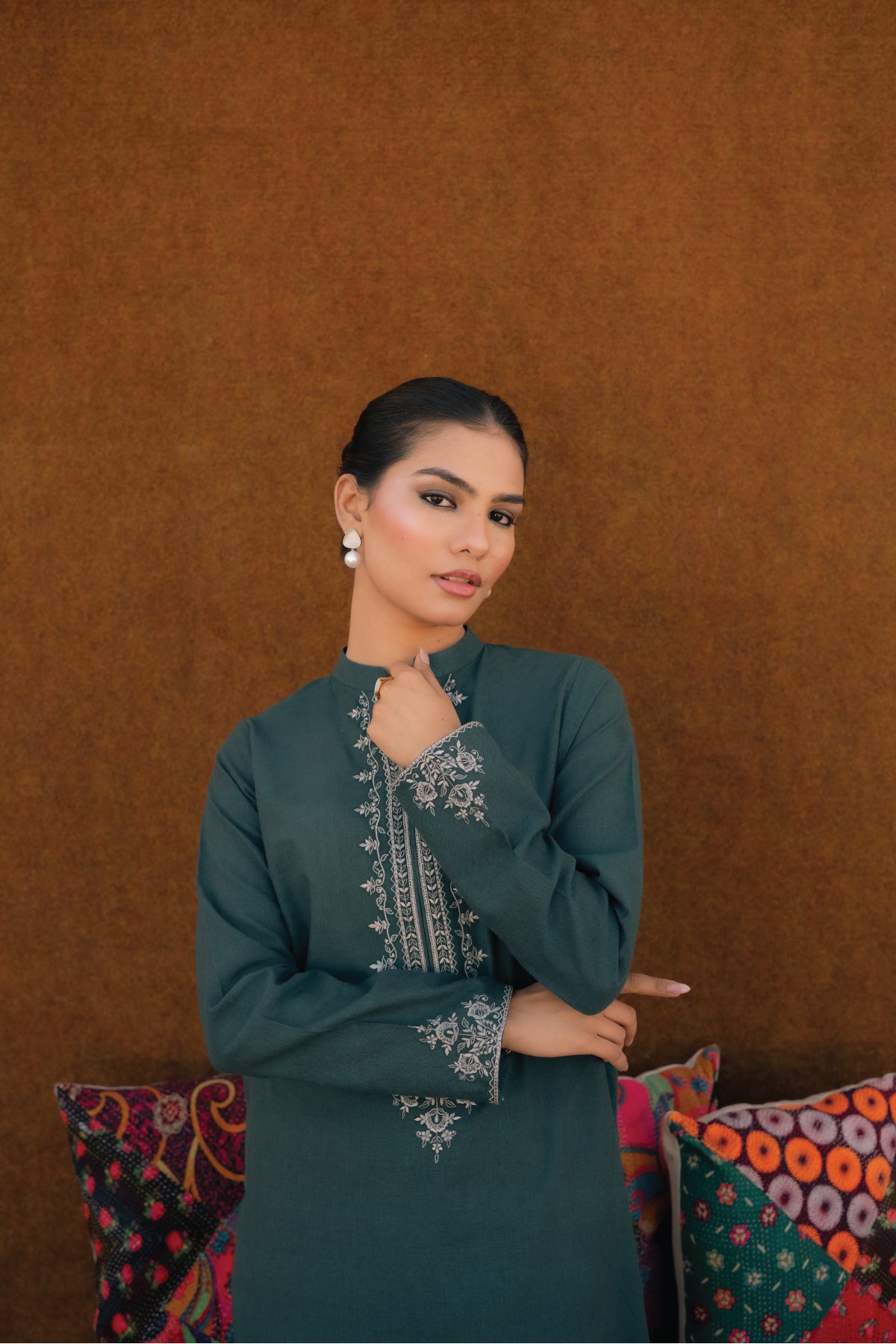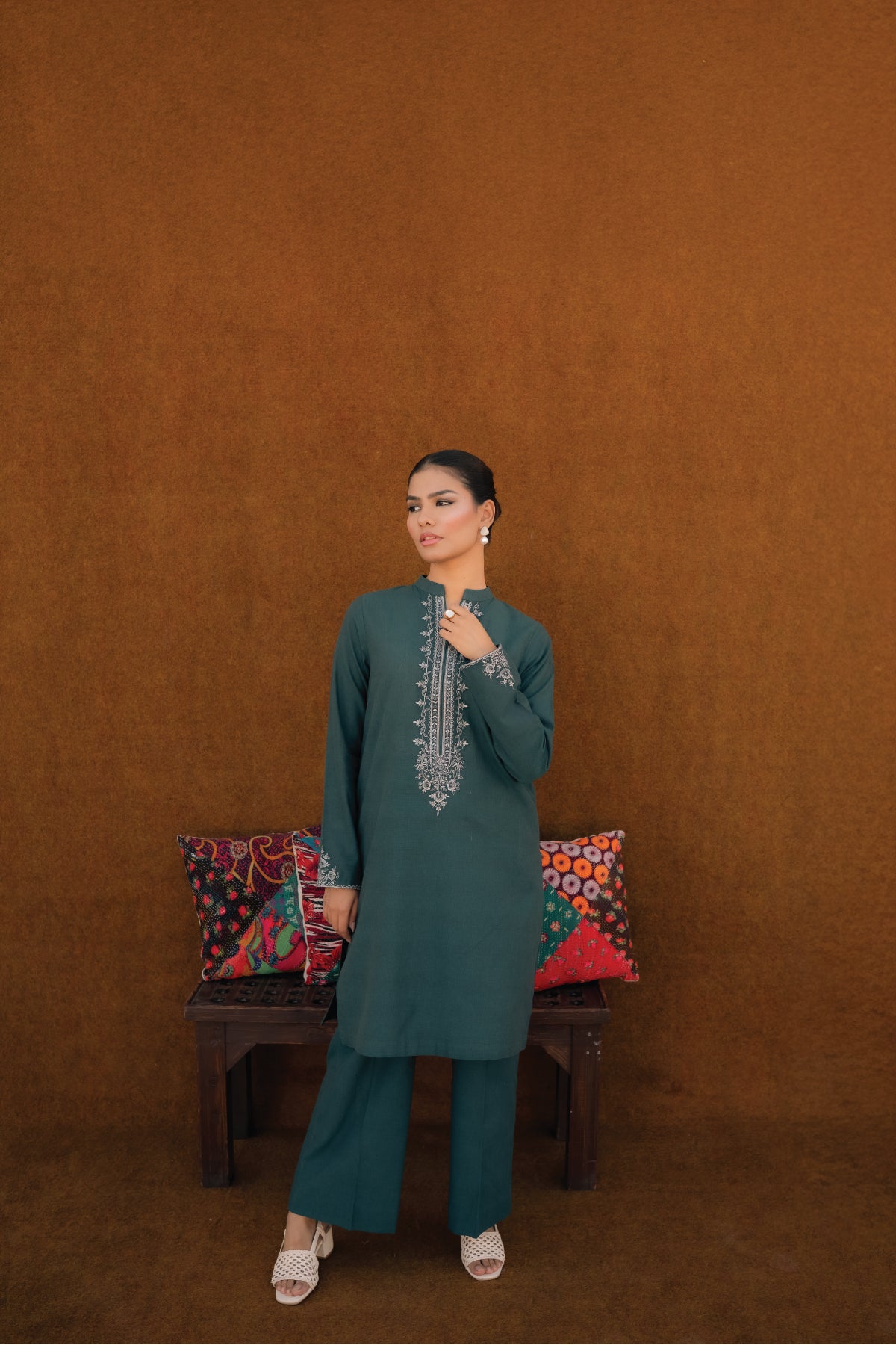 This ban collar shirt features intricate embroidered neckline and sleeves. Paired with a matching wide hem trousers