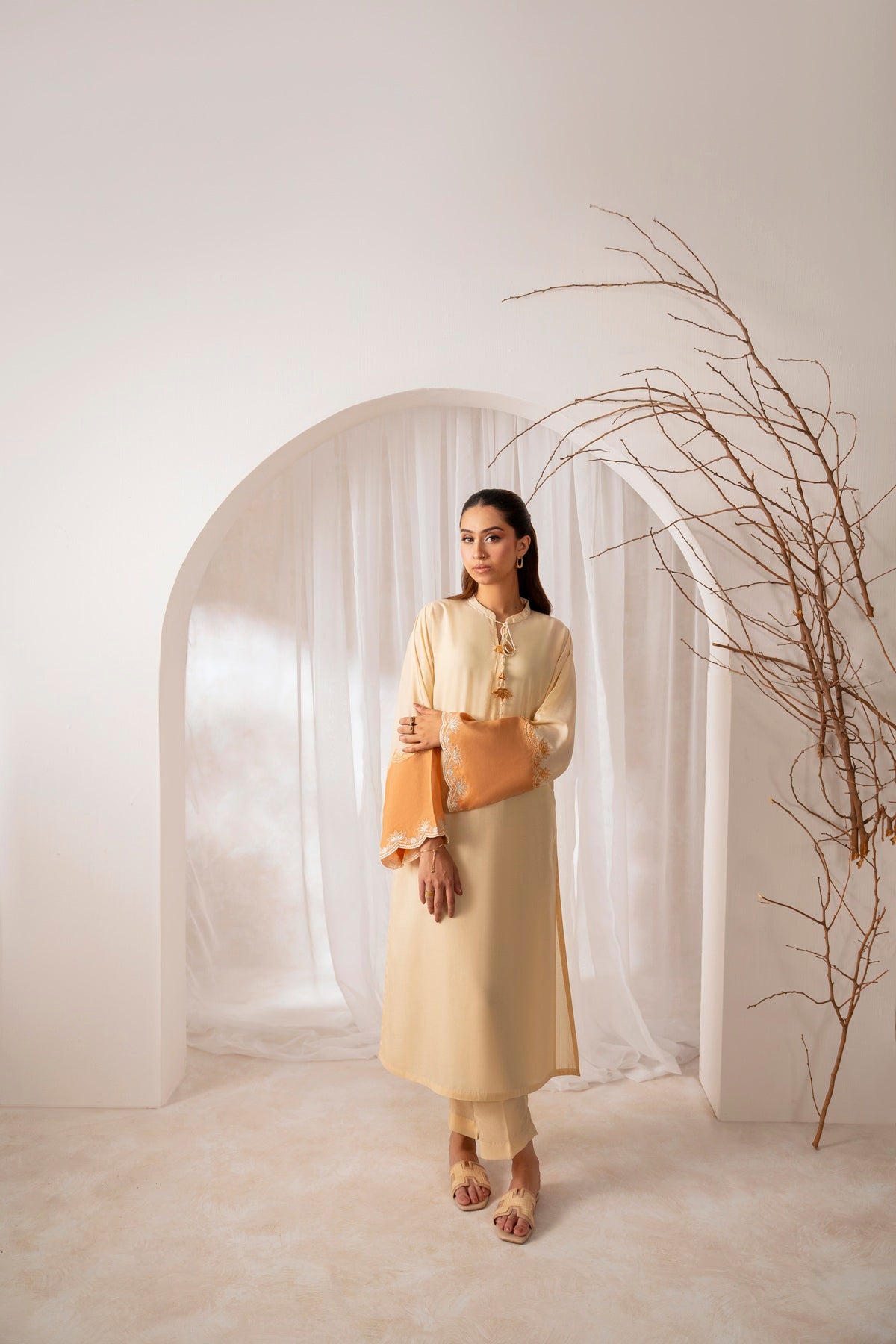 This outfit iis a mix off crème-peach shades includes a long breezy shirt with stylised embroidered sleeves in contrast borders elevating the whole look. Neckline features a ban and embroidered tassles with some pearls. Paired with matching trouser